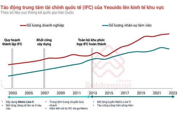 Trước hết, về mặt kinh tế, trung tâm sẽ là kênh huy động vốn hiệu quả, thu hút đầu tư nước ngoài và tạo đột phá nguồn lực. Như tại Yeouido – được thành lập từ năm 2000 với vai trò là CBD (Central Business District) mới của Seoul – đã chứng kiến sự gia tăng mạnh mẽ về doanh nghiệp tài chính, với hơn 55 lượt doanh nghiệp khởi nghiệp và số lượng nhân sự làm việc tăng gấp đôi chỉ trong thập kỷ đầu.