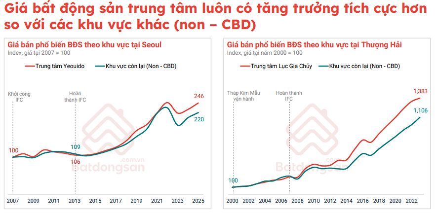 Về bất động sản, lợi ích rõ nét nhất là sự tăng giá trị tài sản. Các so sánh cho thấy, giá bất động sản tại khu CBD luôn cao hơn đáng kể so với khu vực non-CBD. Điều này xuất phát từ việc trung tâm tài chính thu hút lượng lớn các chuyên gia quốc tế, dẫn đến nhu cầu cao về nhà ở, văn phòng và tiện ích.