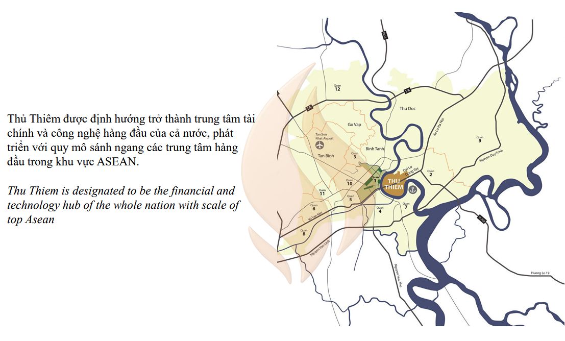 Là khu trung tâm mới, hiện đại và mở rộng của TP.HCM, Thủ Thiêm được định vị làm trung tâm tài chính, thương mại, dịch vụ cao cấp, hội tụ văn hóa và giải trí.