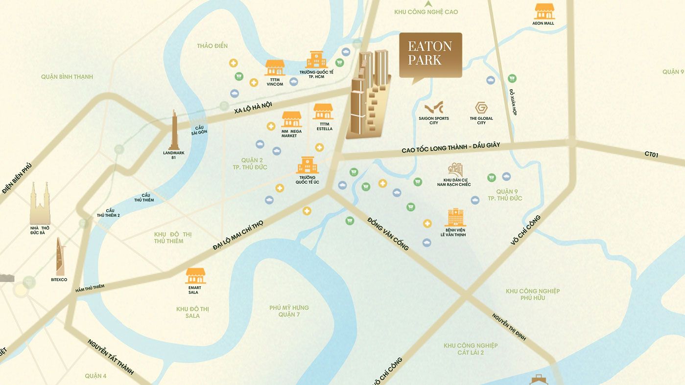 Tọa lạc trên mảnh “đất vàng” giữa lòng Thủ Đức (TP.HCM), ngay mặt tiền đại lộ Mai Chí Thọ, tháp Lagoon Eaton Park nắm giữ vị trí chiến lược hiếm có khi liền kề Khu liên hợp Thể dục Thể thao Quốc gia Rạch Chiếc và các trục giao thông huyết mạch kết nối trung tâm thành phố.