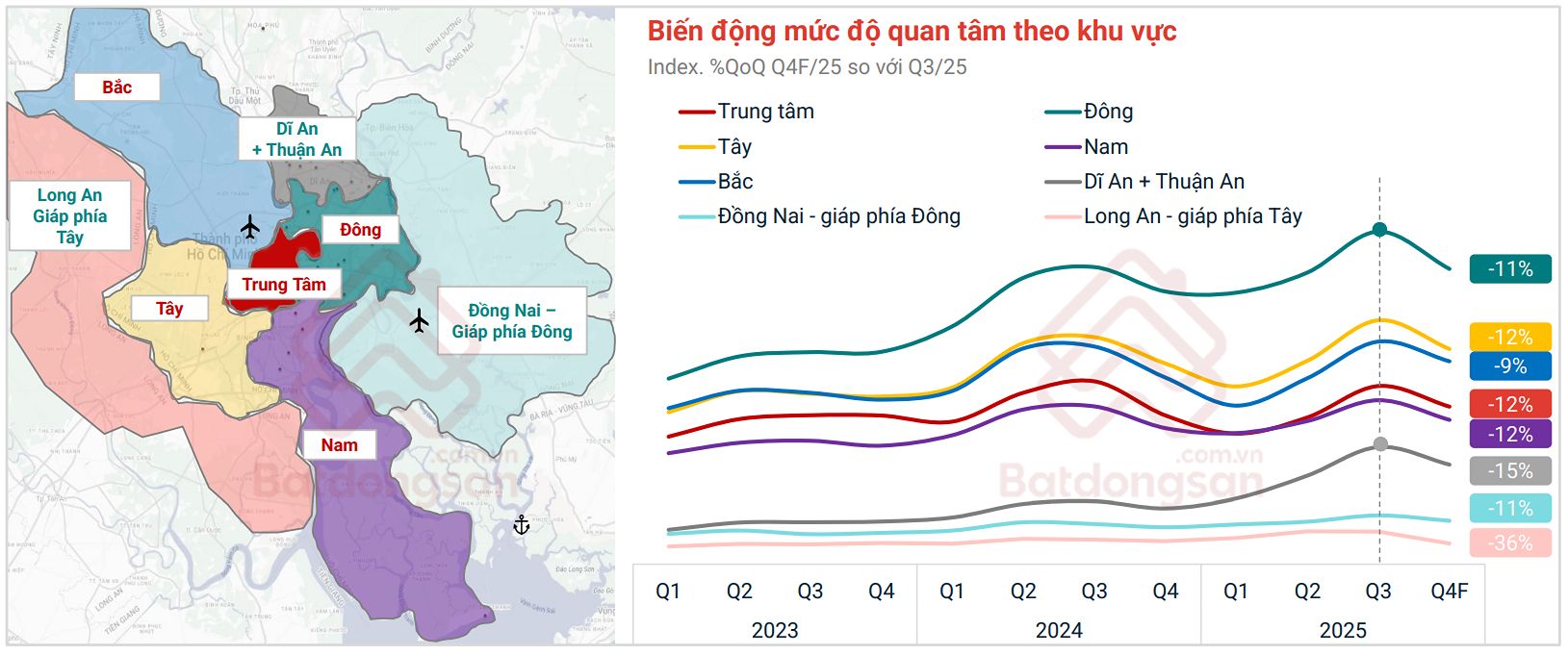 Khu Đông TP.HCM, bao gồm TP Thủ Đức và các khu vực giáp ranh như Đồng Nai, Bình Dương, đã duy trì vị thế dẫn đầu về nhu cầu BĐS trong suốt 3 năm qua. Theo biểu đồ biến động mức độ quan tâm theo khu vực, khu Đông luôn chiếm tỷ lệ cao nhất, với chỉ số tăng trưởng ổn định qua các quý từ 2023 đến 2025.
