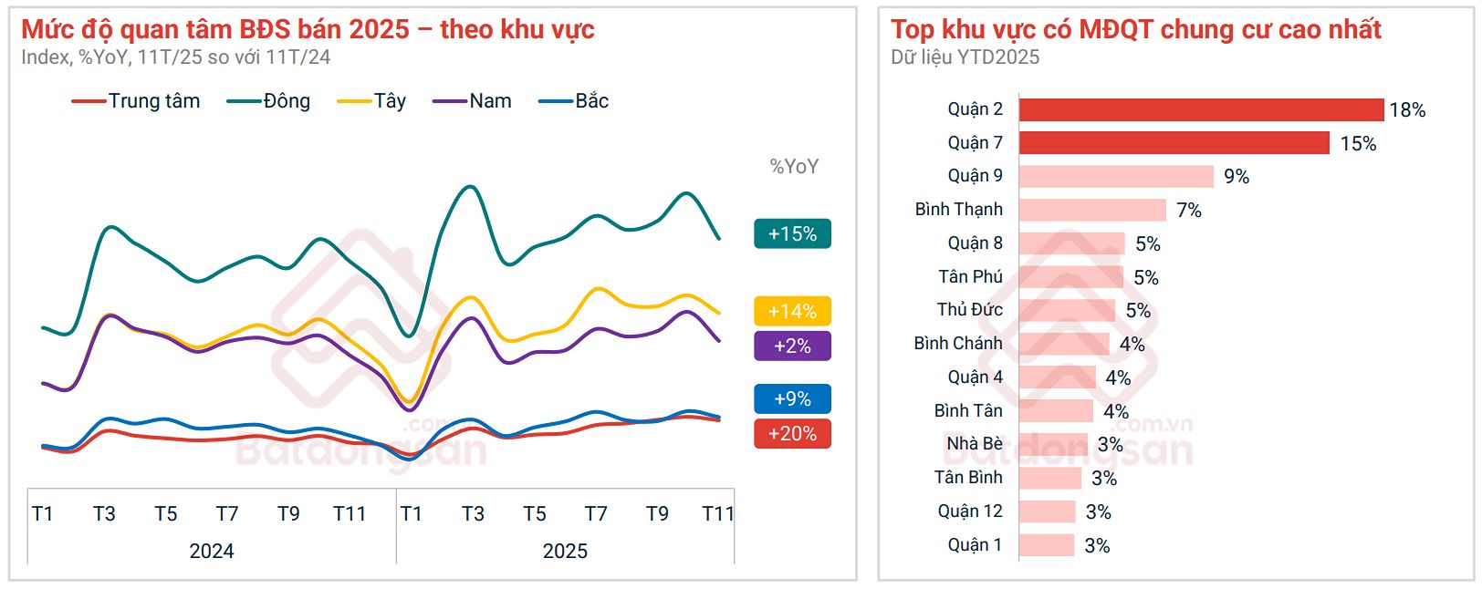 Sự phục hồi mạnh mẽ của nhu cầu chung cư tại HCM năm 2025 cũng tập trung chủ yếu ở phía Đông, với mức tăng YoY lên đến +15% theo tháng. Các quận như Quận 2, Quận 7 và Quận 9 dẫn đầu về mức độ quan tâm chung cư, trong đó Quận 2 đạt 18%, Quận 7 đạt 15% và Quận 9 đạt 9%. Điều này phản ánh rõ nét sự chuyển dịch dân cư về khu Đông, nơi hạ tầng hiện đại và không gian sống xanh hơn.
