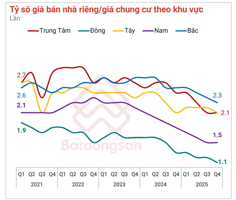Bên cạnh đó, phân khúc nhà riêng và chung cư cho thấy khoảng cách giá bán thu hẹp rõ rệt tại khu Đông và Nam. Tỷ số giá nhà riêng so với chung cư tại khu Đông giảm xuống còn khoảng 1.1 lần, cho thấy chung cư đang trở thành lựa chọn ưu tiên nhờ tiện ích và vị trí.